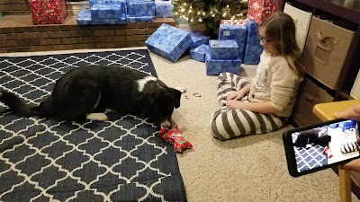 Billy made us a sausage and egg breakfast first thing in the morning. We decided to read the bible story of Jesus' birth afterwards. I had told the kids that we will not open a single gift until we have taken time to reflect on the real reason for the season. We all took turns reading, then did some discussing. We told the kids that after helping out around the house, we would let them open a gift. They were both in awe that they had so many gifts to open. The gifts looked way bigger, I had to package each one in a cardboard box due to lil Miss Millie being super excited to "open" the gifts under the tree...silly puppy. Some of the gifts were clothing items, or things they already knew they were getting too but they were still very grateful and I loved their thoughtfulness about it. Blake even said that it made him feel bad to have so many gifts because he didn't get us that many. I certainly did not want that to happen, but it does make my heart happy to know he thinks about things that way. I love that kid. Both kids are always super appreciative and don't expect big things, that's why it's so fun to give them more and see the surprise.